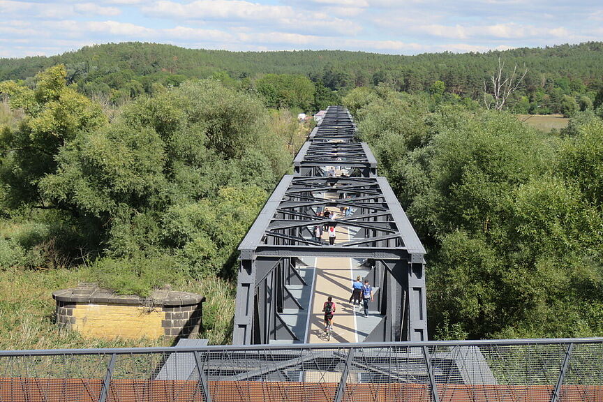 Die ehemalige Eisenbahnbrücke über die Oder zwischen Siekierki-Neurüdnitz wurde für Radfahrende hergerichtet und ist seit Juni 2022 geöffnet. Anlass für ein deutsch-polnisches Europafest am 3. September, das wir mit zwei Fahrradgruppen besuchten.